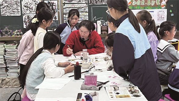 据了解, 队员们从认识中锋、侧锋开始,通过画蚊香圈练习控笔,再慢慢临摹梅花、兰草、金鱼等简单图案。社团辅导老师刘沥总爱从最基础的工具教起:“毛笔要像握鸡蛋那样轻轻捏住,宣纸吸水快,运笔要又快又稳。”当第一片能随风摆动的竹叶出现在纸上时,整个教室都会响起惊喜的欢呼声。