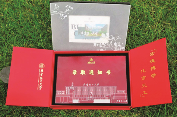国防科大今年的录取通知书继续采取璀璨红金套盒,打开套盒,惊喜一个接着一个。录取通知书封套采用中央对开设计,犹如打开一扇荣耀大门。除通知书外,“高地印象”立体书以手绘带着你“云游”校园。通过被装数据采集卡扫描提交身体数据,新学员们就能在入列首日穿上适体军装。
