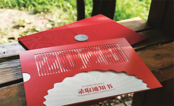 从环保科技到校徽盲盒,浙江工业大学的录取通知书惊喜不断。今年的录取通知书采用烫透工艺,使用微结构模具热压形成,图文0油墨、0溶剂、0染料。不仅生产过程无污染,成品也不含挥发性。三款磁吸校徽随机搭配,科技感满满。从佩戴上校徽的那一刻起,你走的每一步都将是浙工大精神的续写。