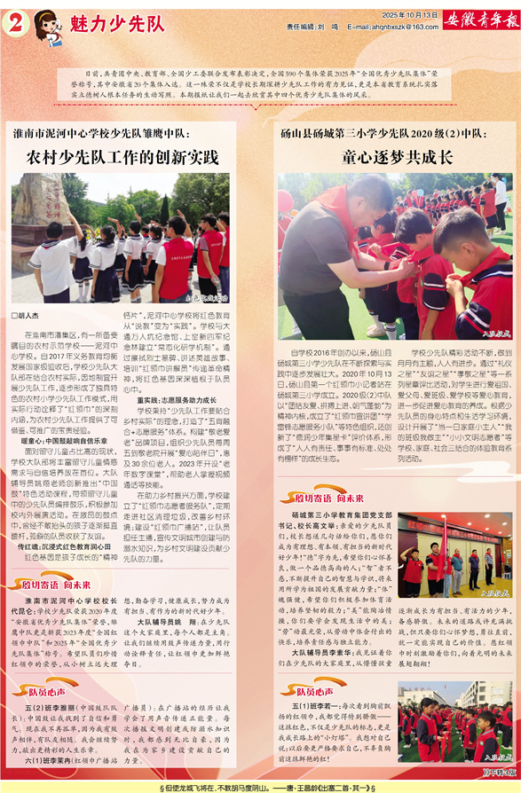 日前,共青团中央、教育部、全国少工委联合发布表彰决定,全国590个集体荣获2025年“全国优秀少先队集体”荣誉称号,其中安徽省20个集体入选。这一殊荣不仅是学校长期深耕少先队工作的有力见证,更是本省教育系统扎实落实立德树人根本任务的生动写照。本期报纸让我们一起去欣赏其中四个优秀少先队集体的风采。