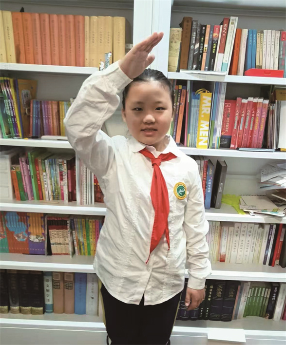 我已经是一名三年级的少先队员了,但我仍然对一年级刚入队时的场景记忆犹新。记得那天在少先队队歌声中,高年级哥哥姐姐为我们系红领巾、教队礼,我们仰望队旗、举臂握拳、大声宣读誓言。辅导员说,红领巾是红旗一角,由革命先烈鲜血染成,队员们要维护它的荣誉。从此,我便与红领巾结下情谊。